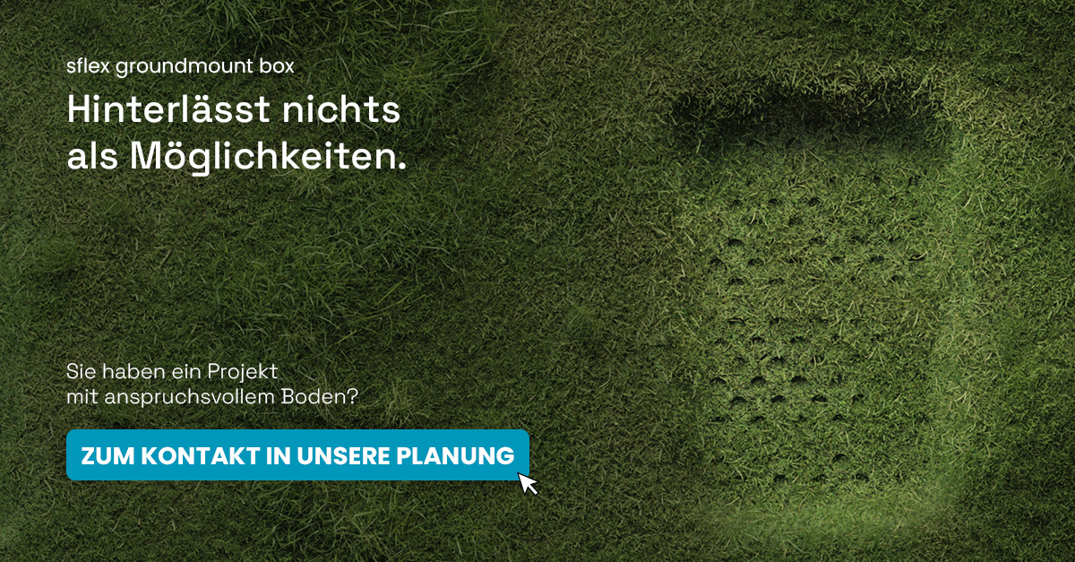 Mit der neuen groundmount box erweitert S:FLEX das Angebot im Bereich Freilandtechnik um ein Montagesystem, das selbst auf sensiblen oder schwer zugänglichen Flächen eingesetzt werden kann. Das Besondere: Die groundmount box kommt vollständig ohne Fundament, Rammung oder Anker aus – und hinterlässt damit buchstäblich keine Spuren im Boden.
